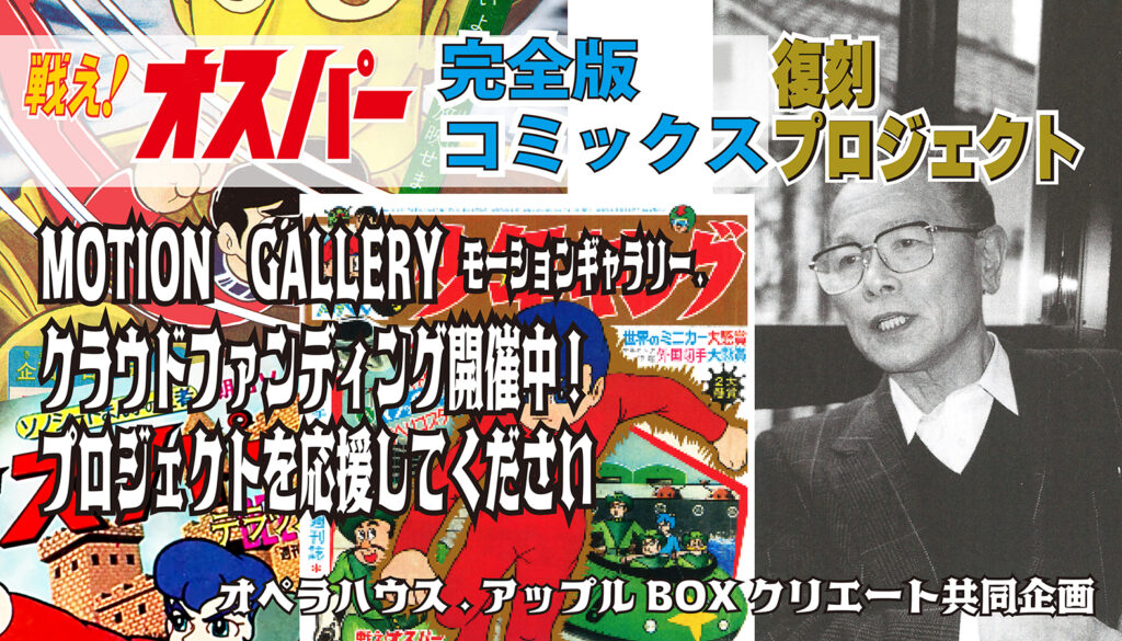 「戦え!オスパー」コミックスが奇跡の完全復刻。 クラウドファンディングは1月16日18時よりMotion Galleryで開始。参加されたコレクターの皆様にだけ、送られる珠玉のメモリアルコミックボックスです。 クラウドファンディング期間は2月24日までと限られますから、このチャンスをお見逃しなく。